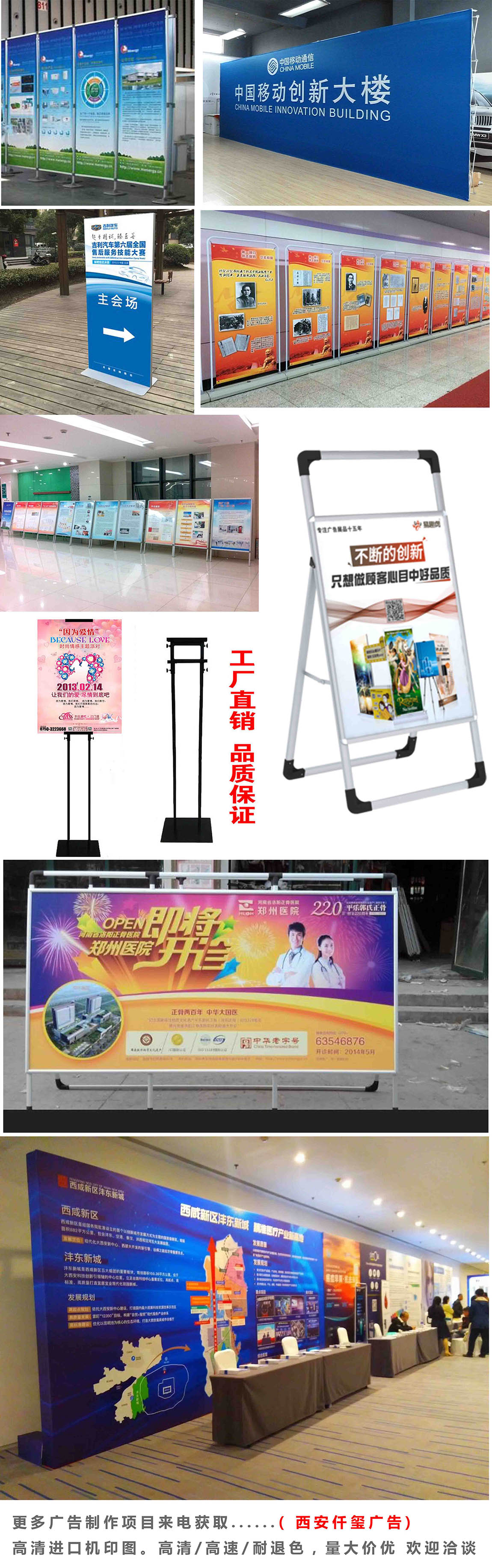 主要制作:公司形象包裝、形象墻裝飾、5米/3米注水旗、易拉寶、展板、立屏展架、門形展架,海報、拉網展架、X展架,不銹鋼A3/A4水牌,強磁臺卡,手舉牌,一米線隔離欄桿,手提海報架,展板架,促銷臺,蘋果立牌,雙桿立牌,POP海報架,移動宣傳欄,三角掛畫架,桌面立牌,落地旗桿,不銹鋼伸縮旗桿,木畫架、畫框、噴繪、桁架、會議物料制作.簽到板,易拉寶,水晶字,亞克力,kt板,不銹鋼牌.噴繪桁架,簽到板,易拉寶海報彩頁拉網快展架印刷制度kt板印刷送貨 . 長安大學城 噴繪桁架|簽到板|會議背景板|快展|拉網|易拉寶|海報彩頁印刷|送貨 |噴繪桁架|出租搭建|西安雁塔區海報會議背景板|簽到板|噴繪桁架|出租搭建|易拉寶|門形展架|快展架|拉網展架|海報印刷 .西安仟璽廣告會議展會搭建、廣告物料制作,長安大學城畫架、長安大學城畫框、長安大學城噴繪背景租賃、長安大學城噴繪桁架、長安大學城背景桁架、長安大學城廣告物料制作以產品質量贏得客戶;以價值服務贏得市場;以嶄新的姿態期待與您合作共贏!