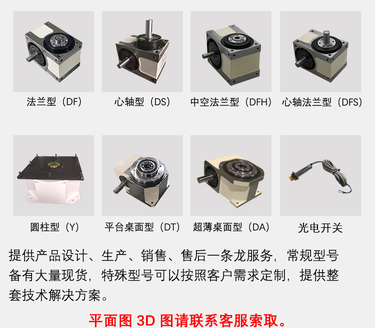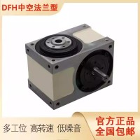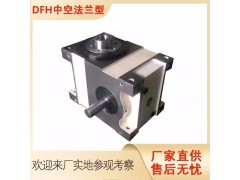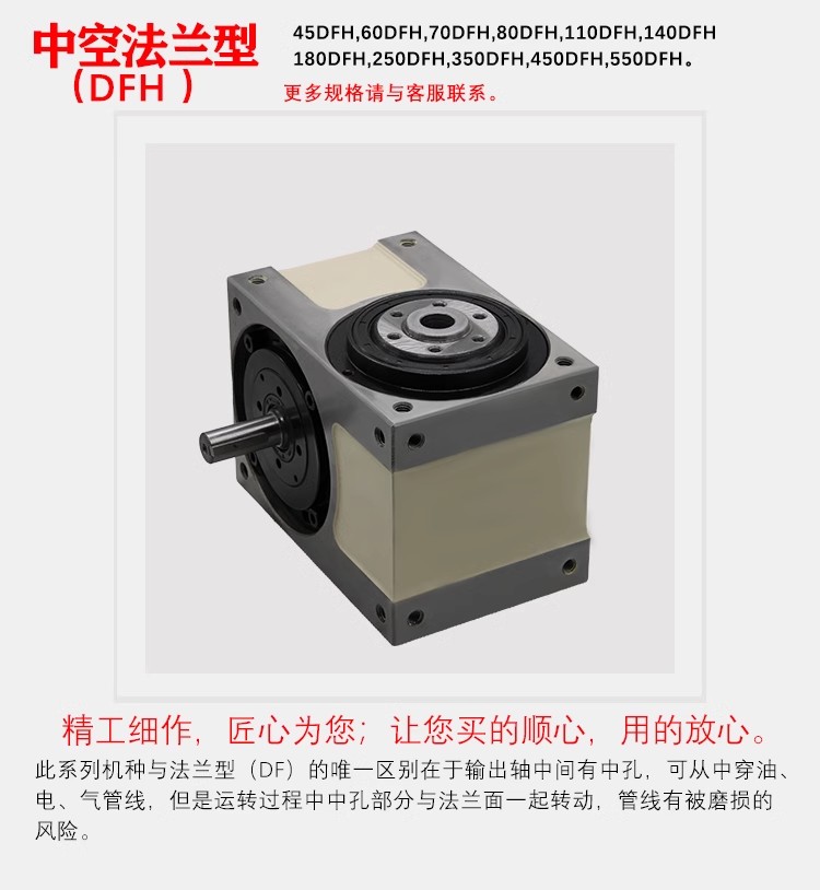 此系列機種具有重負荷性,可承受較大的垂直徑向或軸向壓力,其輸出軸為法蘭盤式設計,有凸緣中心、盤面螺孔、定位銷孔、固定面積大,可使連接件更具堅實平穩。適用于較大負荷的回轉式圓盤驅動場合,被廣泛使用在各類盤式加工機械及類似機構的產業機械,自動化間隙驅動部,驅動圓盤。 與法蘭型(DF)的區別在于輸出軸中間有中孔,可從中穿油、電、氣管線,但是運轉過程中中孔部分與法蘭面一起轉動。