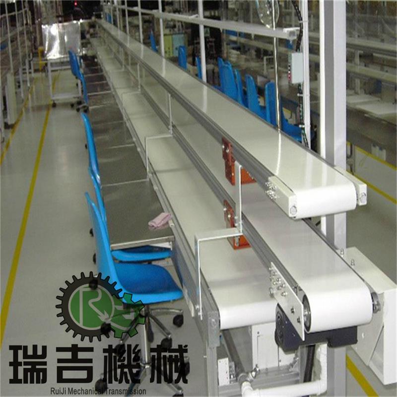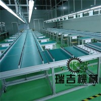 皮帶流水裝配線可進行水平、傾斜輸送,也可組成空間輸送線路,輸送線路一般是固定的,流水線輸送能力大,運距長,還可在輸送過程中同時完成若干工藝操作,所以運用十分廣泛,輸送帶的材質(zhì)有:橡膠、硅膠、PVC、PU等多種材質(zhì),除用于普通物料的輸送外,還可滿足耐油、耐腐蝕、防靜電等有特殊要求物料的輸送,結(jié)構(gòu)形式有:槽型皮帶機、平型皮帶機、爬坡皮帶機、轉(zhuǎn)彎皮帶機等多種形式,輸送帶上還可增設提升擋板、裙邊等附件,能滿足各種工藝要求,輸送機兩側(cè)配以工作臺、加裝燈架,可作為電子儀表裝配,食品包裝等皮帶裝配線。