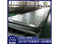 板鏈流水裝配線采用大節(jié)距特種板鏈條為傳送介質(zhì),帶動金屬面板作循環(huán)往復運行的一種輸送裝配設備,適用于形狀不規(guī)則物品的重載輸送,鏈條選用空心大輥子帶附件鏈條,在兩側(cè)同步鏈條的附件上用板狀構(gòu)件連接使輸送方向形成連續(xù)的平板,因而運行平穩(wěn),該機與鏈式或輥筒輸送機配合使用可實現(xiàn)轉(zhuǎn)角輸送,因控制方式的不同,可實現(xiàn)連續(xù)和間歇運行,由于線體結(jié)構(gòu)及輸送介質(zhì)較為堅固,所以一般用在較重物品的輸送和裝配作業(yè)現(xiàn)場。